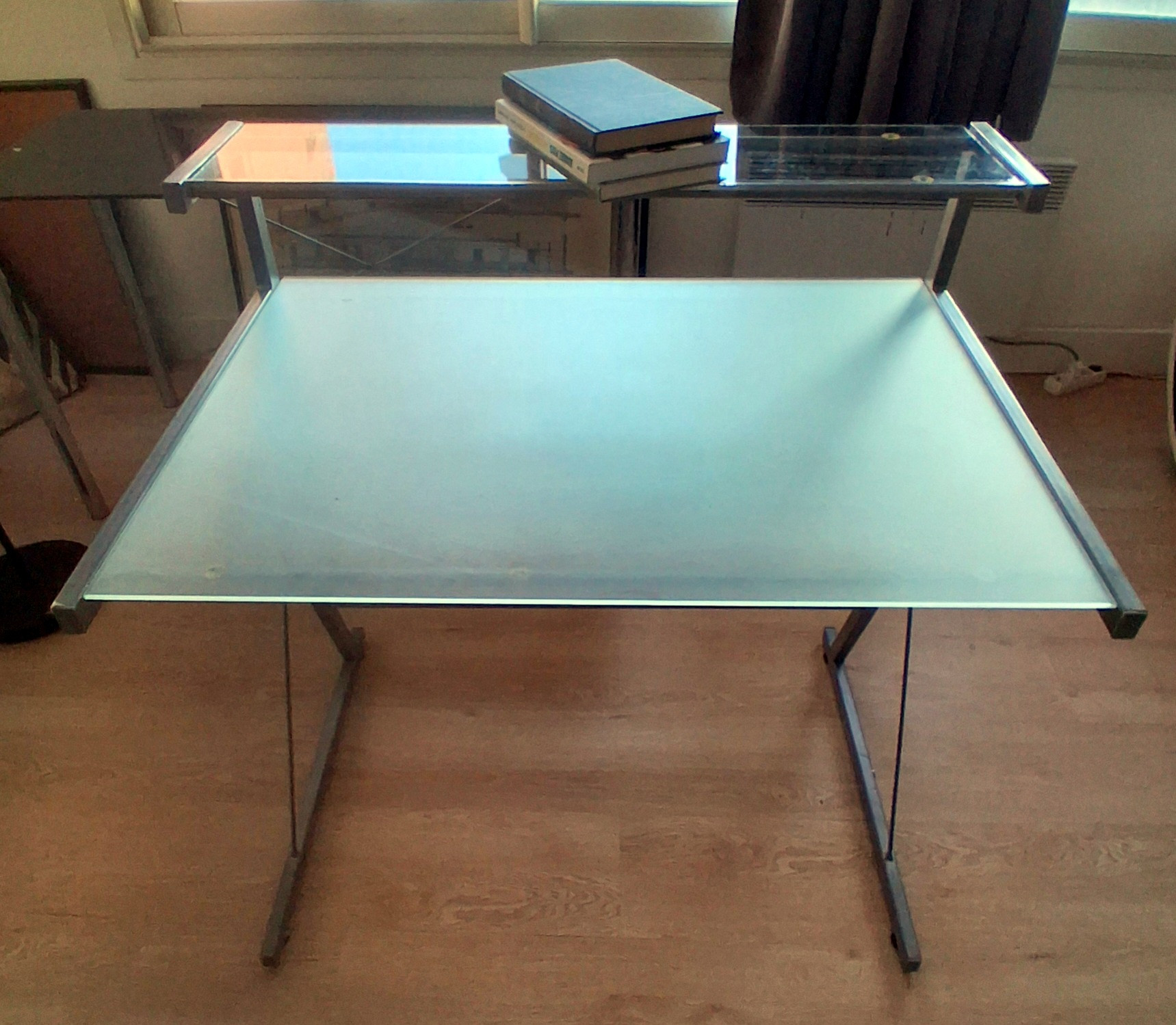 Bureau avec 2 plateaux : table + tablette en verre sur structure métallique. H totale : 95 cm H depuis la table : 75 cm Largeur : 90 cm Profondeur : 60 cm PAS DE LIVRAISON - A retirer sur Ajaccio