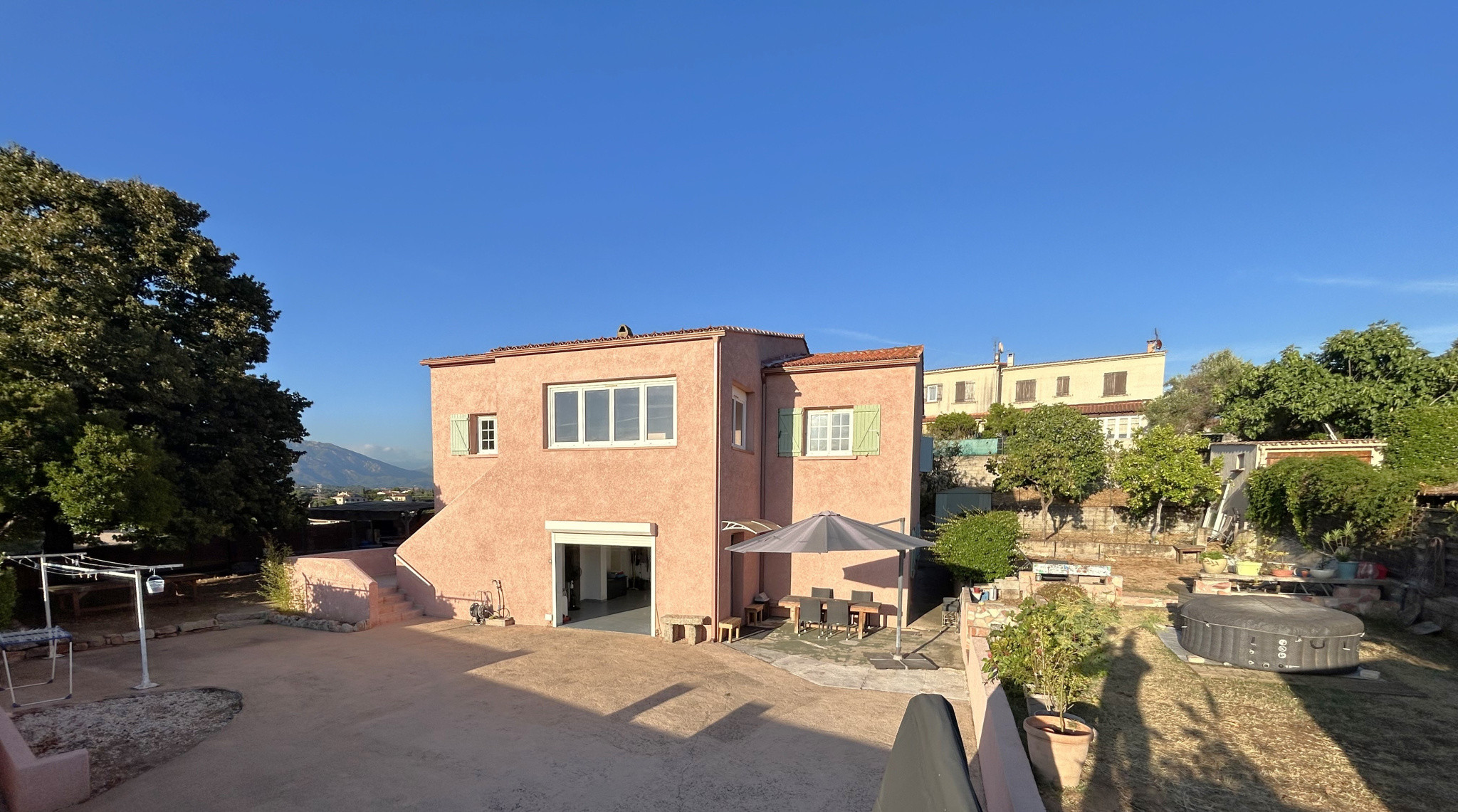 Mezzavia (Confina 1), maison sur 2 niveaux. F4 + F3, entrées indépendantes. 100m2 et 70 m2 avec terrain plat et arboré de 900 m2 avec terrasses, jardin, abri et parking. Garage 20 m2 ave buanderie + caves/débarras. Étage : F4, séjour, cuisine équipée + cellier, 3 chambres, sub, wc. Loggia de 14,5 m2. RDC : F3, cuisine équipée neuve ouverte sur séjour, 2 chambres avec rangements, salle d'eau, wc. 530 000€. 06 47 04 65 46